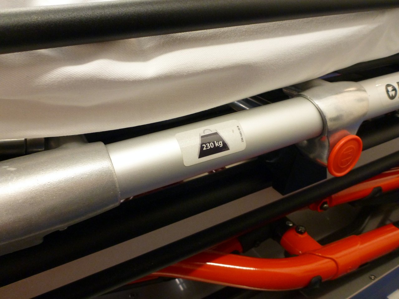 Nach ein bisschen Fragerei über den Zustand der Schmerzen etc., kamen wir zu zwei Entschlüssen: Zum einen brauchten wir einen Arzt, damit dieser etwas gegen die Schmerzen machen kann, zum Anderen ein Fahrzeug, was dieses Gewicht auch auf eine Trage bekommt. Laut dem Aufkleber auf der Trage hätte das bei uns vielleicht gepasst, aber die Frau würde dann wahrscheinlich unsere schmale Trage mit dem Fett, was links und rechts übertreten würde, verschlingen.