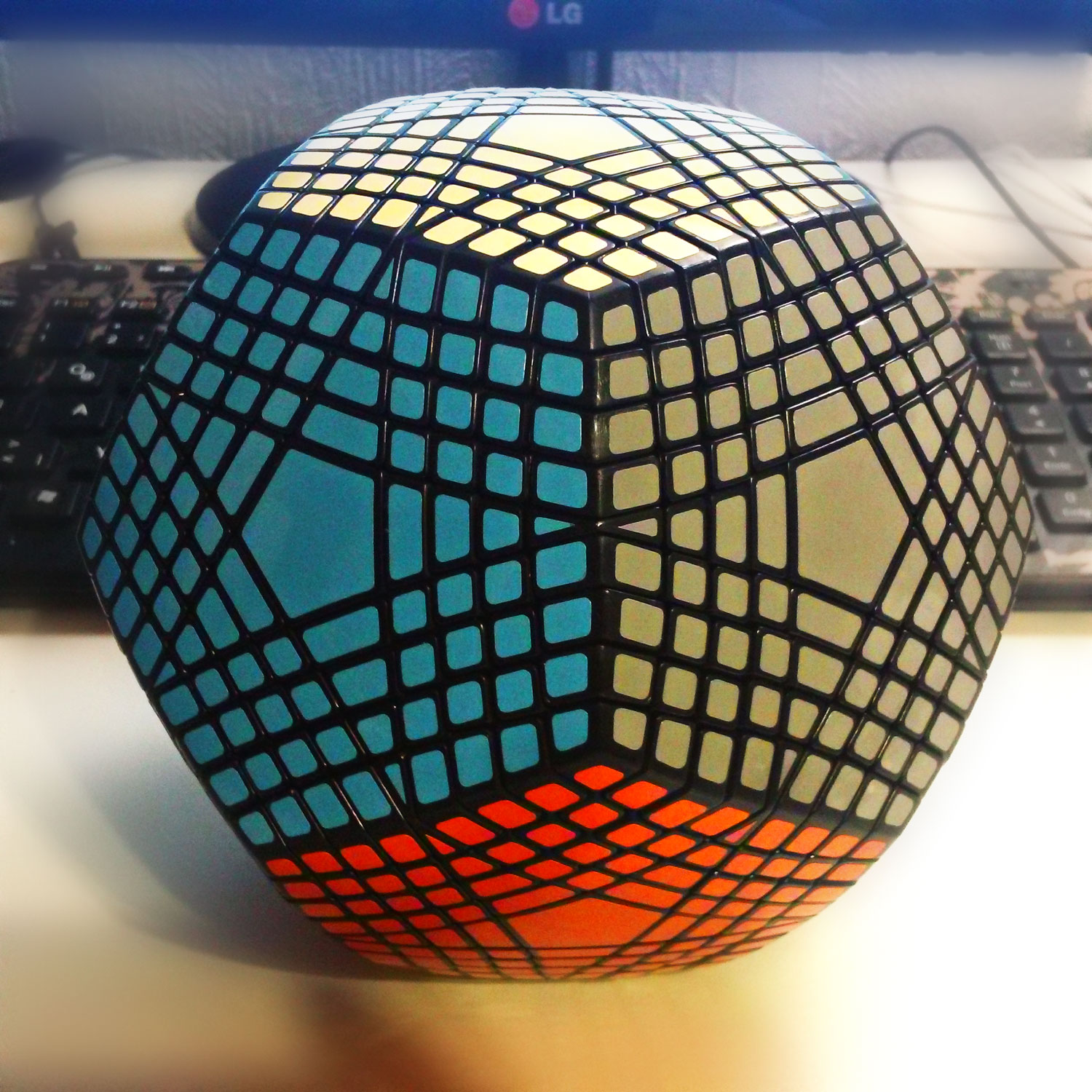 Ihr könnt damit nichts anfangen, konnte ich bis vor gut einer Woche auch noch nicht. Es ist ein Megaminx in XXL-Format mit sage und schreibe 9 Ebenen.